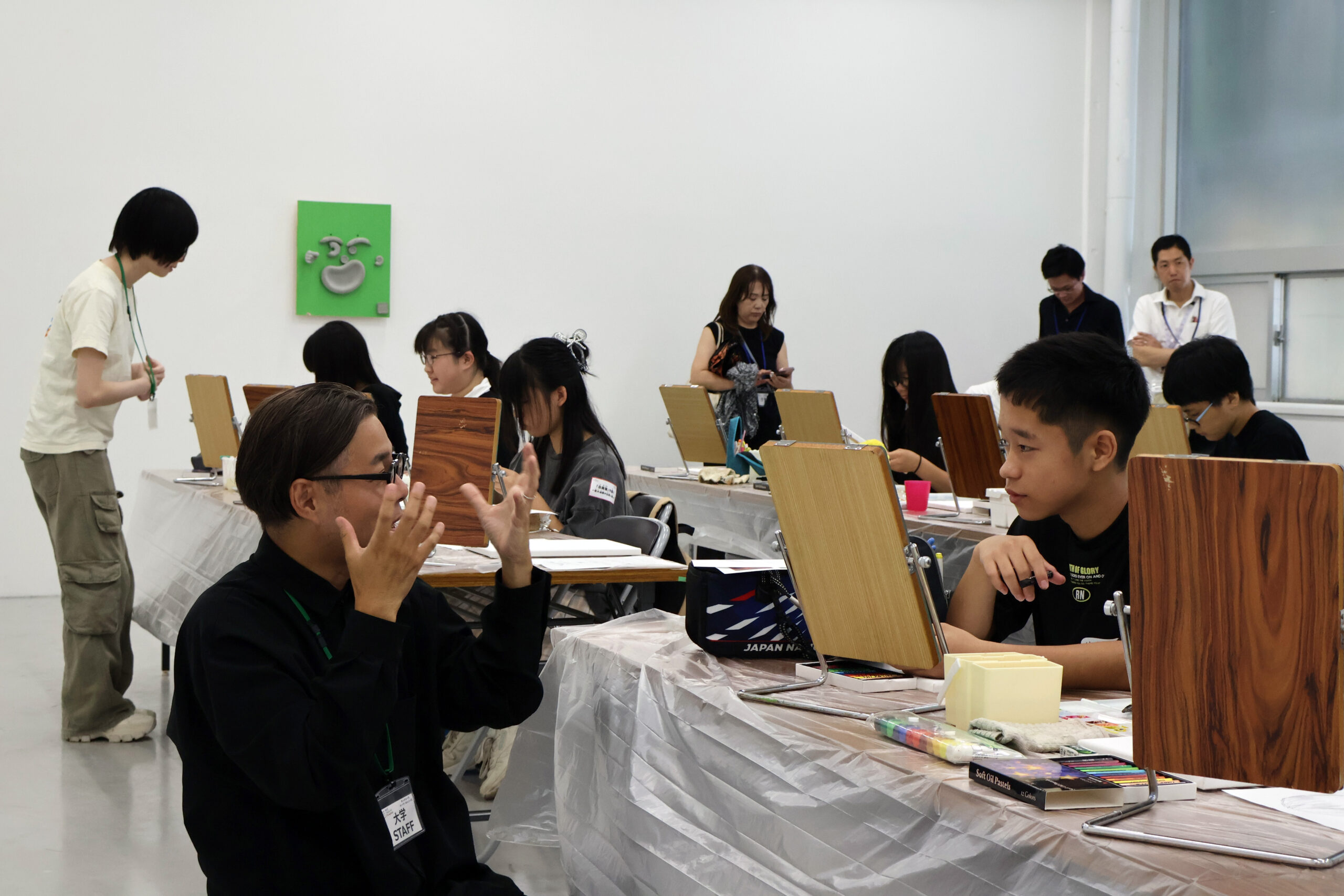 明るいアトリエ空間に並ぶ机の上には、自画像用の鏡が1人1台用意され、撮影されたポートレートを横に、写真に写る自分と鏡の中の自分の姿とを見ながら、集中して制作していきます。子供たちの中には、宮本先生やアシスタントの学生から「白をもっと使ってもいいと思う」「背景の描き方を工夫してみるのもいいよ」などのアドバイスを受けたり、普段の興味や将来についての会話をしながら制作する子も。周りを気にせず、鏡やポートレートを見つめながら自分のペースで描き進めている子供もいて、みんなそれぞれの方法で制作を進めていました。